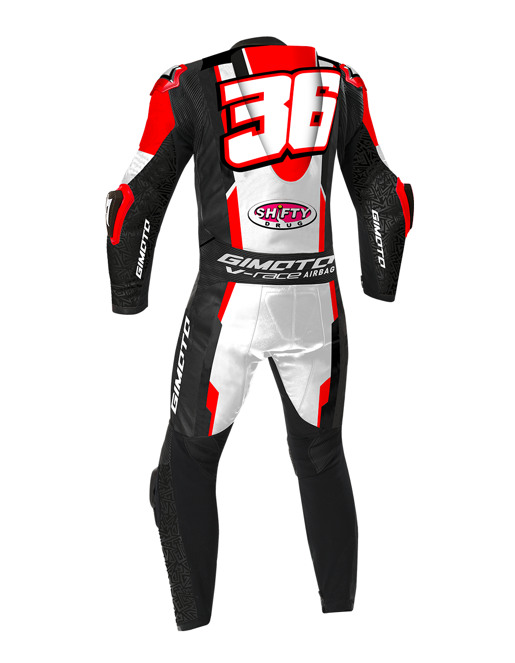 Tailor-made and customizable The suit can be made to measure and customized with colors, finishes, accessories, sponsors, and logos. It is compatible with Gimoto's V-RACE RR airbag system and other airbag systems.